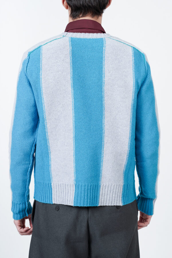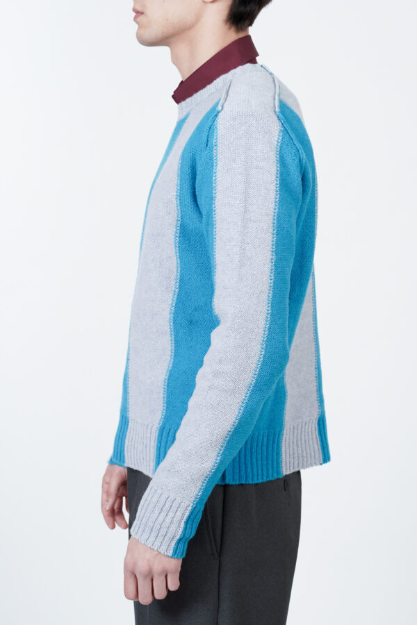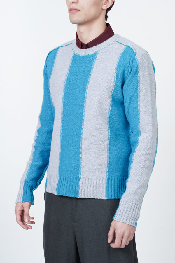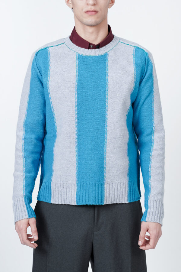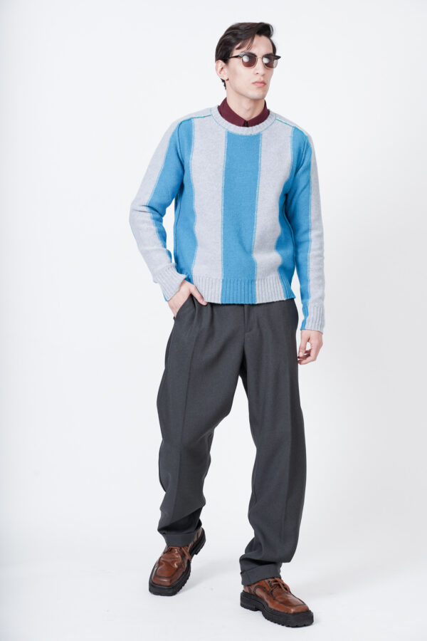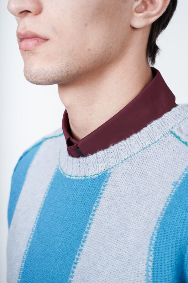 Regular fit sweater with a colour block design in shades of light blue, long sleeves and a crewneck collar. Made of 100% pure virgin wool.