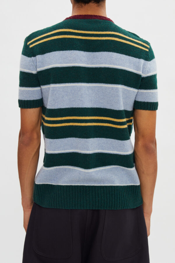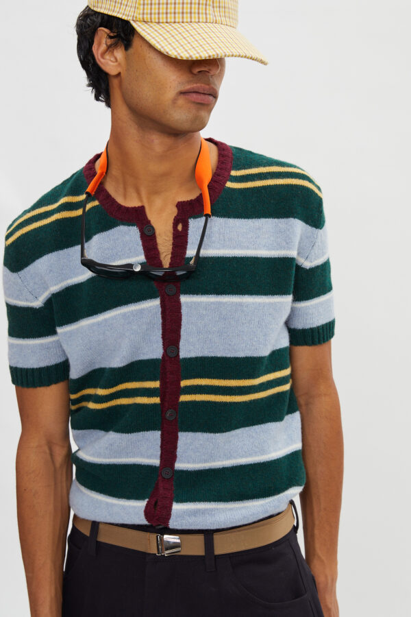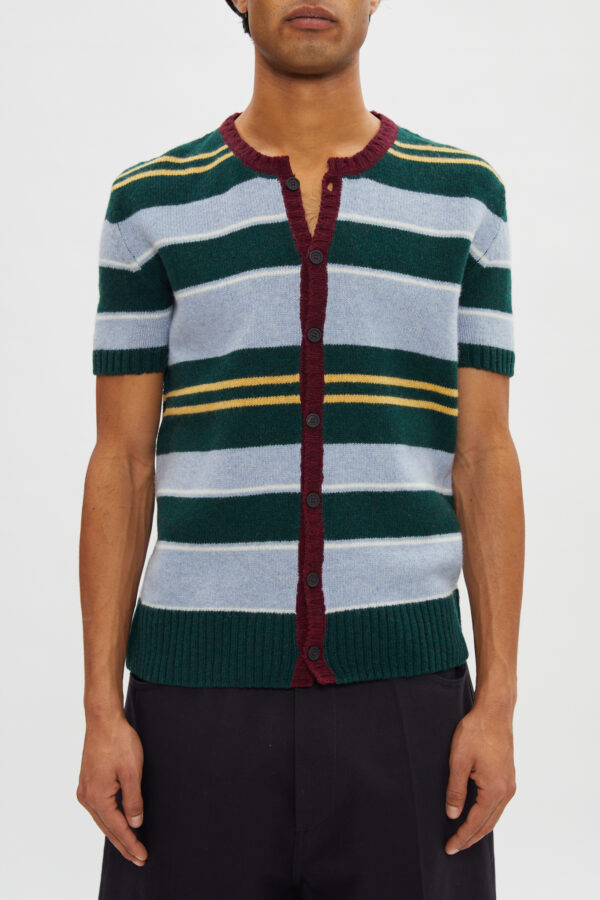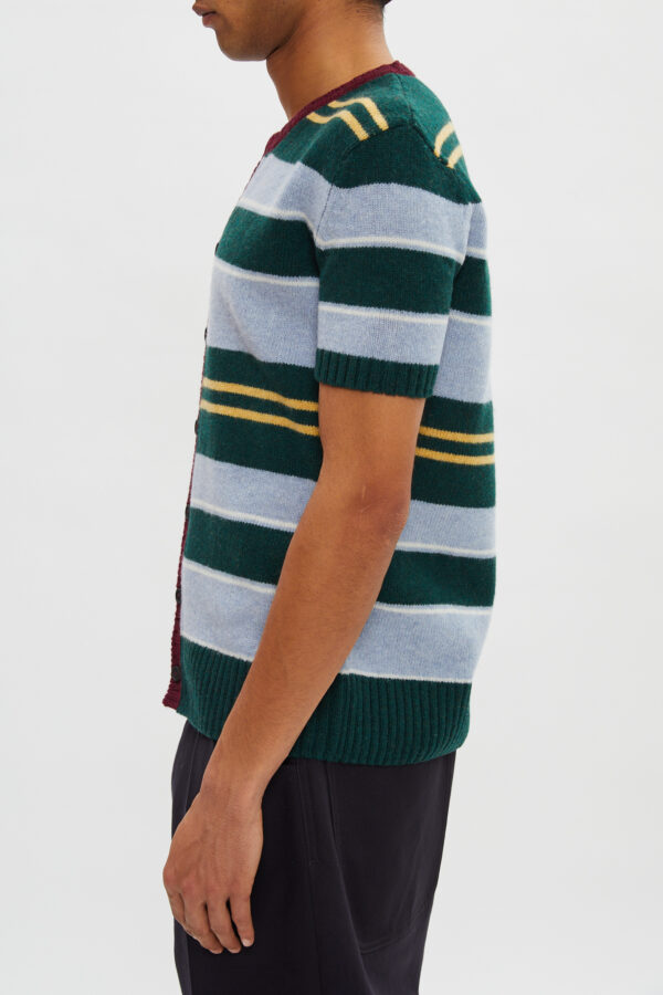 Striped short sleeves knit cardigan in 100% shetland wool.